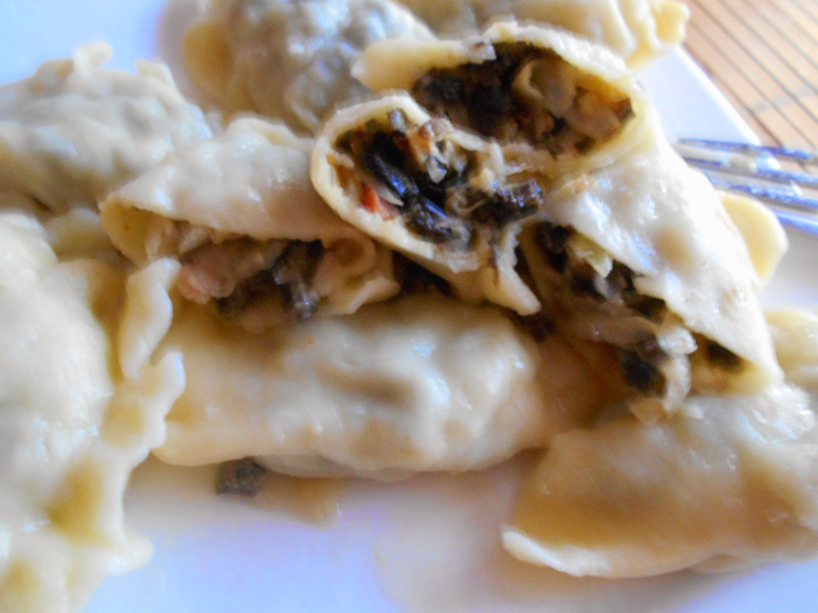 Kapustę wypłukać i odcisnąć. Grzyby kapustę i cebulę drobno posiekać i obsmażyć na masełku klarowanym. Gdy nasz farsz wystygnie dodajemy rozbite jajko i bułkę tartą, doprawiamy i nadziewamy ciasto.