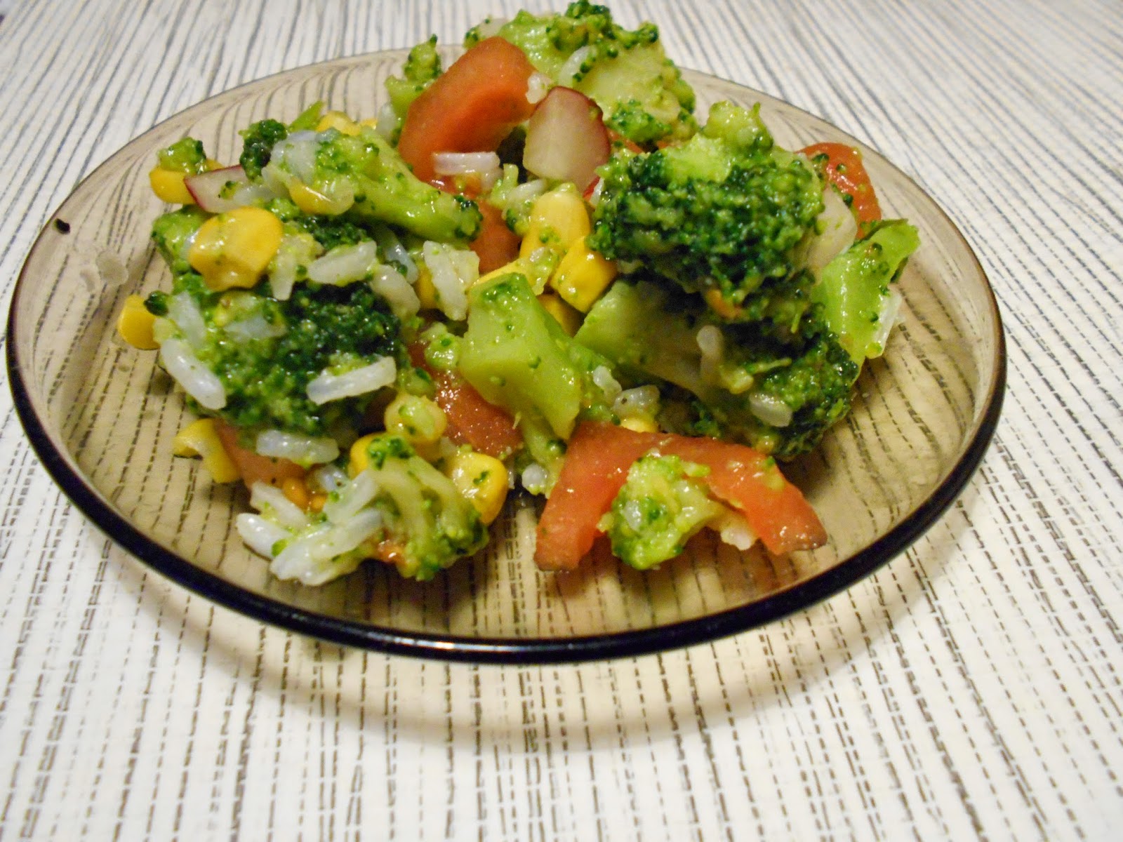 Czekamy, aż się zagotuje i wyłączamy z gazu i zostawiamy w gorącej wodzie dopóki nie uznamy, że jest odpowiednio miękki. Odcedzamy na durszlaku. Kroimy pomidora i rzodkiewkę, dodajemy ryż i kukurydzę, odcedzonego zimnego brokuła i mieszamy. Dodajemy do smaku pieprz i odrobinę soli.